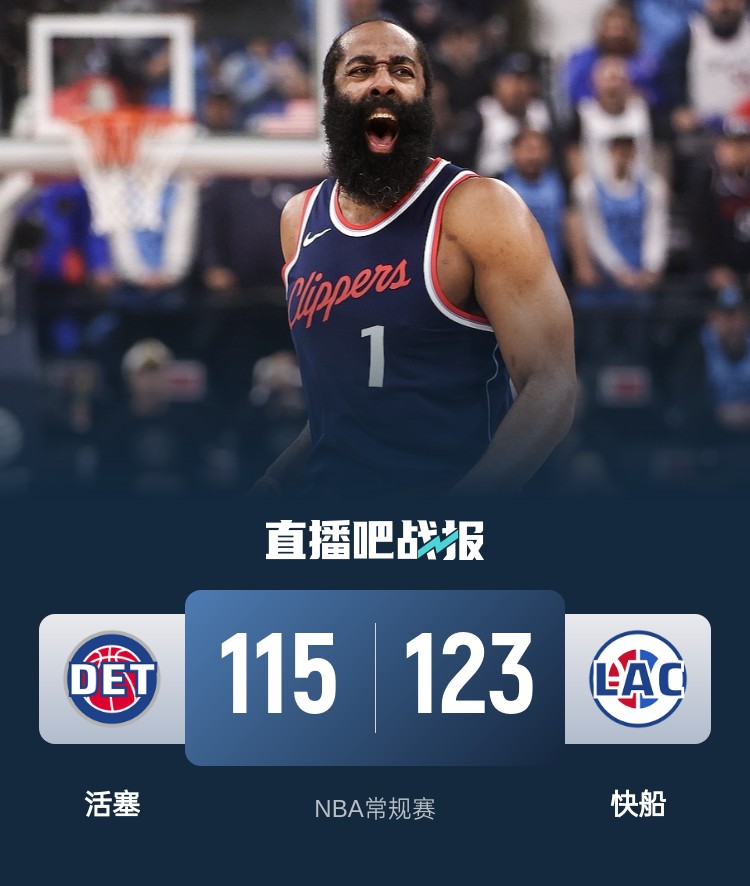 快船缺少多名核心的情况下压力来到了哈登身上,不过他开局状态爆表连砍17分,连续三分外加制造对手三分犯规的疯狂表现为球队取得两位数领先;整个第一节快船拿到32分,哈登独揽其中23分;活塞开局被当头一棒,不过他们抓住快船轮换薄弱的机会在末段连续追分稳住局面;次节活塞在局面上压制快船不断蚕食分差,最后时刻一波7-0的攻势抹平比分进入下半场。休息归来双方持续拉锯,哈登和康宁汉姆率领各自球队展开博弈势均力敌,末节决胜博格达诺维奇命中两记三分率先发难,随后哈登再度站出来连续单打轰下11分,他的疯砍表现帮助快船拉开比分奠定胜局。最终,快船力克活塞结束3连败。