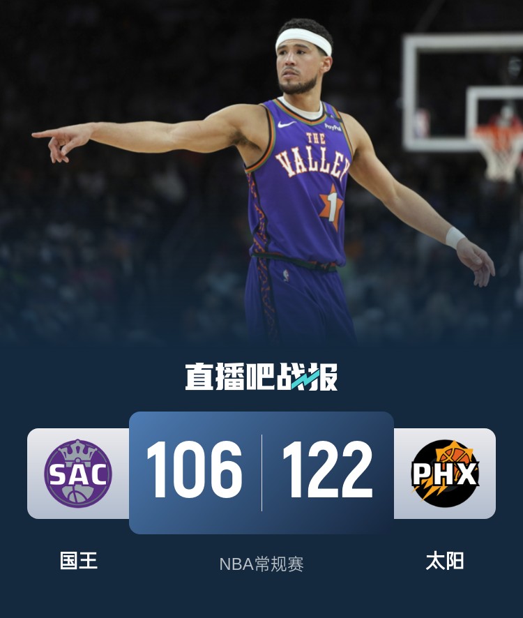 一开场,太阳率先发力,杜兰特和布克联手拿分,琼斯也连中三分帮助球队取得两位数优势,次节太阳命中率下降,国王频频冲击内线连投带罚不断缩小分差,半场战罢太阳62-57领先国王。下半场,太阳连中三分重获两位数优势,普拉姆利肘到小萨博尼斯被直接驱逐,但太阳多点开花保持优势,末节太阳将分差拉开到20分以上,国王苦苦追赶无果。最终,太阳122-106轻取国王,主场过关。