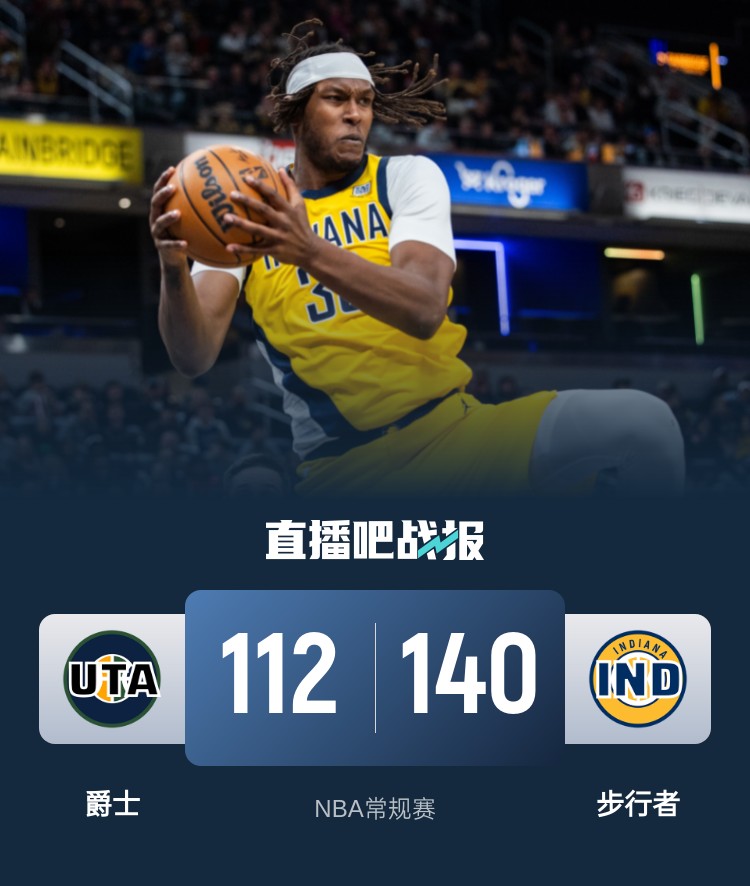 特纳26+7+6帽 西卡22+5+5 塞克斯顿27分 步行者送爵士8连败