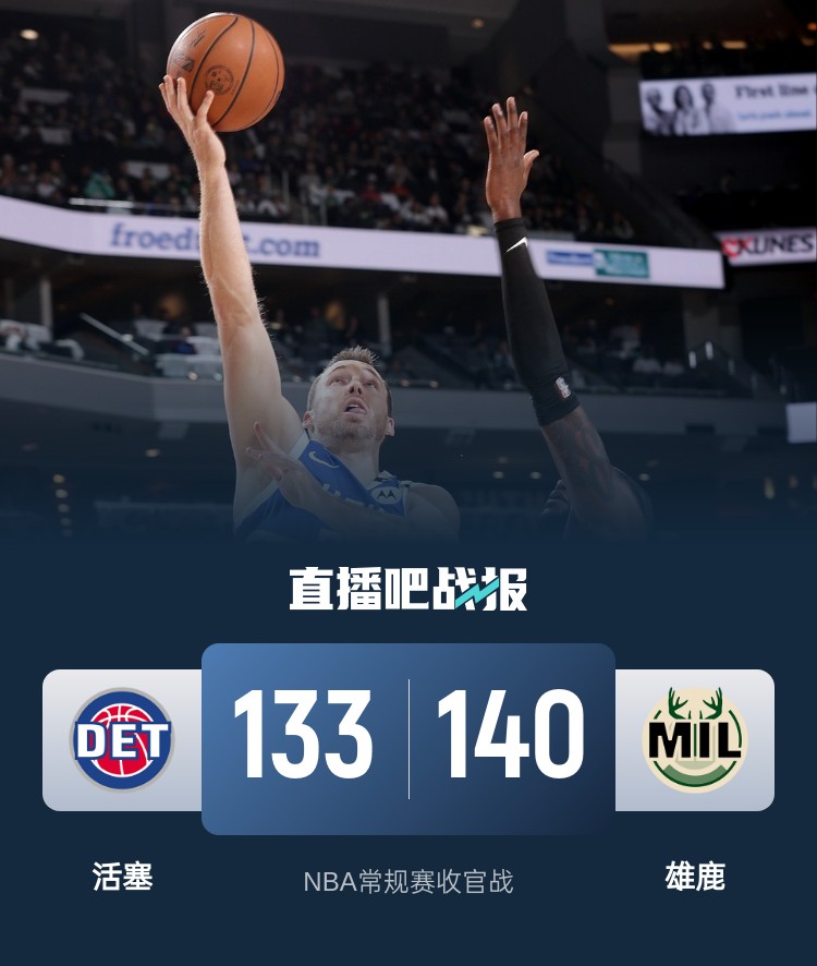 比赛开始后两队在外线连续对飚三分,随后库兹马和康诺顿火力全开帮助雄鹿单节轰下43分并建立起两位数优势。第二节比斯利外线接连开火带领活塞和雄鹿大打对攻战。下半场回来比斯利连续三记三分带领活塞掀起反扑迫近比分,康诺顿和泰勒-史密斯轮番拿分为雄鹿稳住局面。最后一节活塞势头依旧凶猛,萨瑟一记三分帮助活塞反超比分,此后两队多次打成平手,但最后关头雄鹿连得8分重新建立优势,活塞16秒三记三分将比赛拖入加时。加时赛中雄鹿以8-0开局,此后活塞未能再追上比分,最终雄鹿加时140-133击败活塞以8连胜收官。