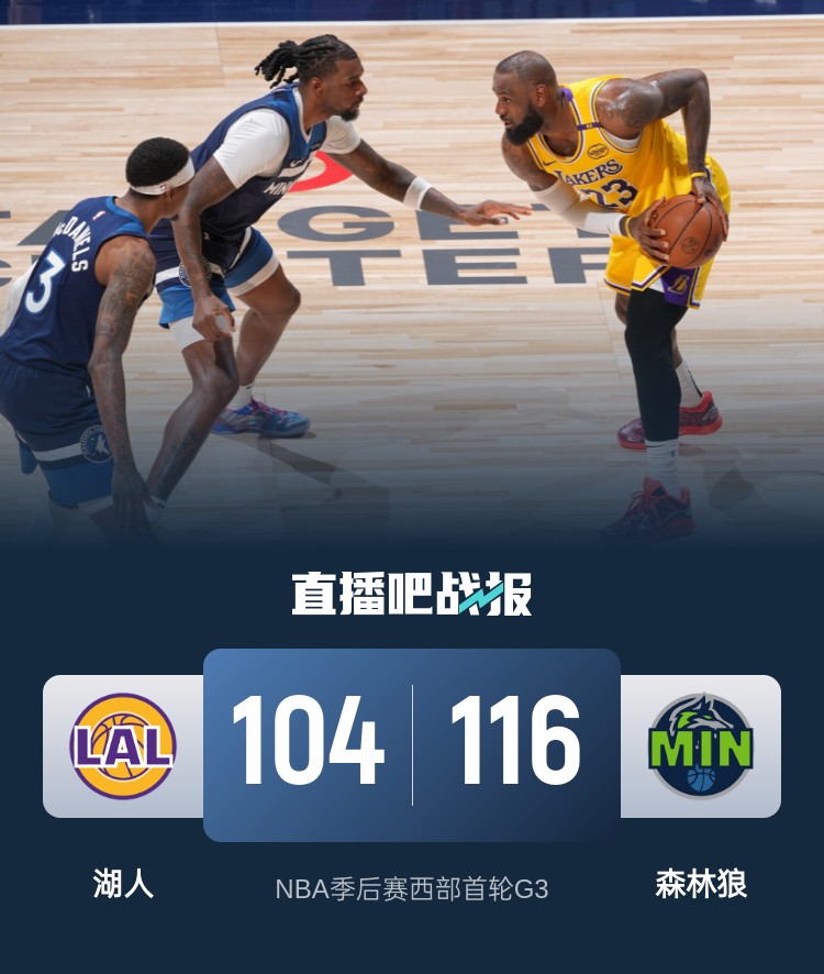 4月26日讯 NBA季后赛继续开打,森林狼和湖人今日移师明尼苏达迎来G3之战,在洛杉矶的两场对决双方各胜一场战成平手。