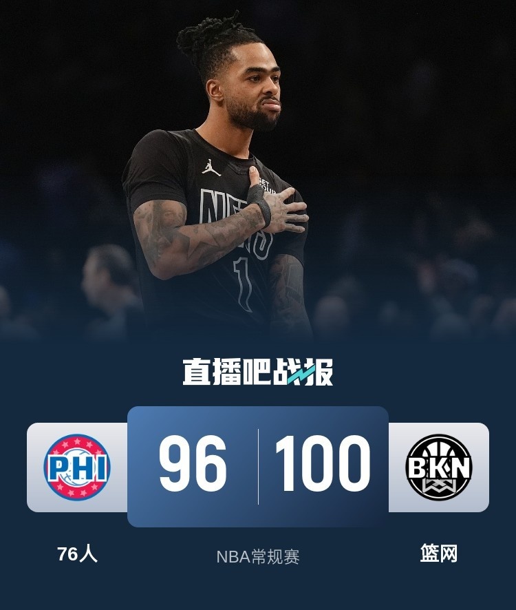 首节开打后拉塞尔和克拉克斯顿接连取分,乌布雷和格莱姆斯连造杀伤及时止血,两队你来我往比分紧咬,首节结束时篮网领先2分,次节回来,中段76人进攻出现停滞,篮网内外结合一波8-1拉开比分,末段76人及时复苏缩小分差,半场战罢,篮网领先4分。短暂休整后76人延续追分势头,格莱姆斯飚中三分后一度反超,但拉塞尔率队及时回应,篮网领先10分进入末节,末节上来,乌布雷予取予求保留悬念,拉塞尔关键时刻进攻犯规,但76人追分未果,最终篮网100-96力克对手。