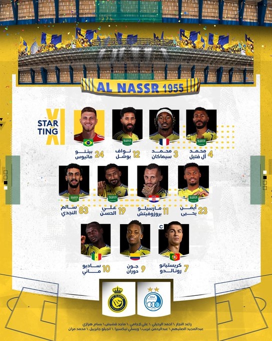利雅得胜利首发:24-本托、12-纳瓦夫、3-西马坎、4-法蒂尔、83-纳吉迪、19-哈桑、11-布罗佐维奇、23-叶海亚、10-马内、9-杜兰、7-C罗