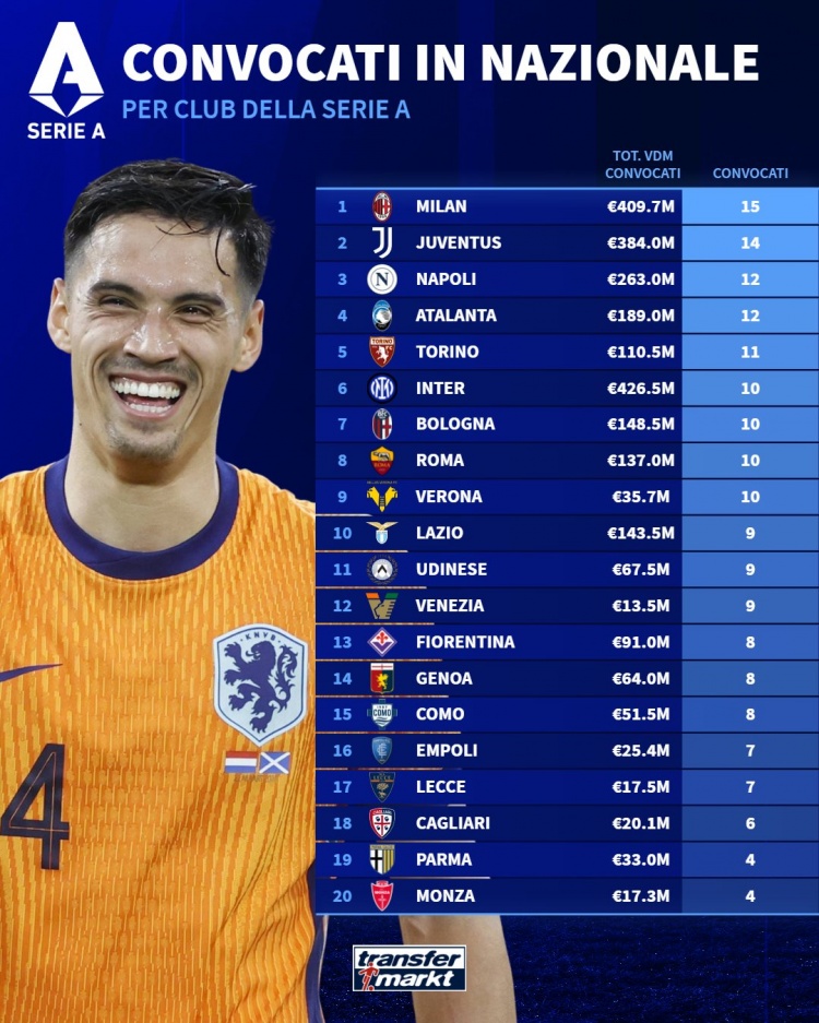 3月18日讯 德国转会市场统计了意甲俱乐部被国家队征召的球员人数,并列出榜单,米兰15人最多,尤文14人次席。