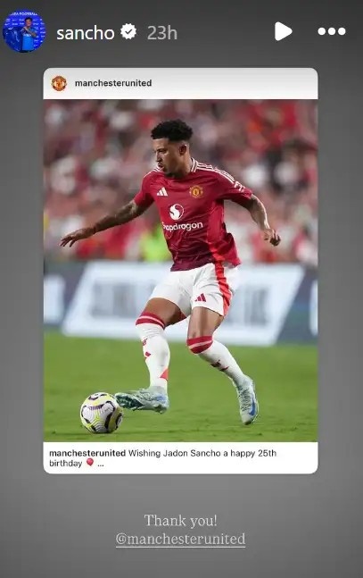 桑乔本赛季被曼联外租到切尔西,3月25日他迎来自己的25岁生日,虽然桑乔与曼联的关系似乎已经破裂,但在生日那天,曼联官方Instagram还是晒出了一张桑乔身披曼联球衣的照片,并配文:“祝桑乔25岁生日快乐!”