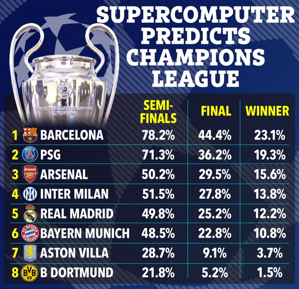 超算预测欧冠晋级概率:巴萨最大热门 巴黎、枪手、国米有望4强