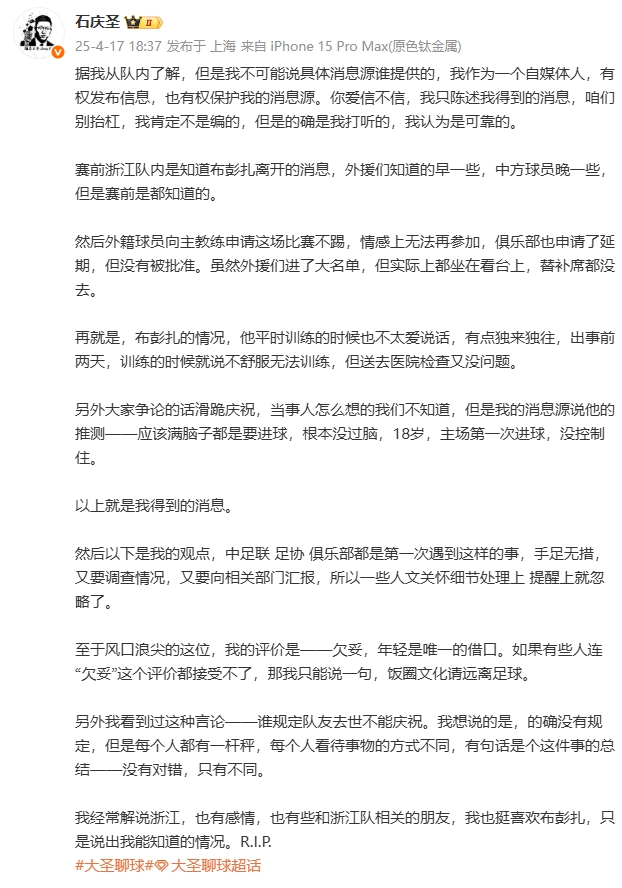 我经常解说浙江,也有感情,也有些和浙江队相关的朋友,我也挺喜欢布彭扎,只是说出我能知道的情况。R.I.P.