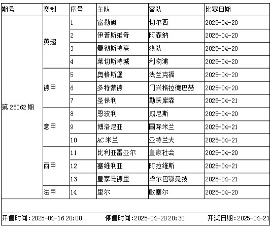 传足胜负彩第25062期竞猜对阵中不乏豪门:英超联赛,阿森纳客场挑战伊普斯维奇,利物浦客场面对莱切斯特城;意甲,国米客场迎战实力不弱的博洛尼亚;西甲,皇马主场对决毕尔巴鄂。
