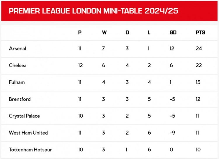 24-25赛季英超伦敦德比积分榜(阿森纳、切尔西、富勒姆、布伦特福德、水晶宫、西汉姆、热刺)/(球队、场次、胜平负、净胜球、积分)