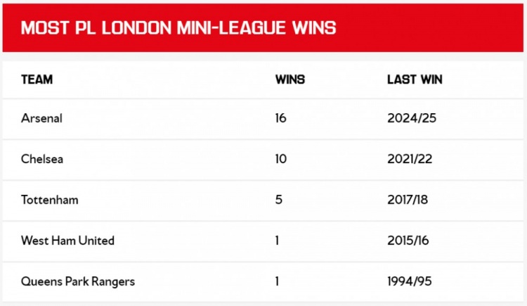因为枪手已经连续第三个赛季在伦敦球队迷你积分榜上拔得头筹,且从伦敦德比战中获得的积分比其他任何球队都多。除了在对阵死敌热刺的比赛中取得两胜外,还在对阵切尔西、富勒姆和布伦特福德的比赛中各取4分,同时在对阵水晶宫的比赛中打进5球,西汉姆则是本赛季迄今为止唯一击败枪手的首都俱乐部。