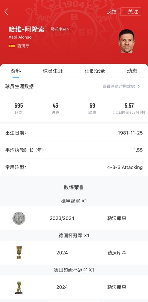 阿隆索现年43岁,西班牙籍主帅,球员时期曾效力过皇家社会、利物浦、皇马以及拜仁等队。他于2022年10月正式成为勒沃库森一线队主帅,执教球队至今,他带领球队夺得一个德甲冠军、一个德国杯冠军以及一座德国超级杯冠军。