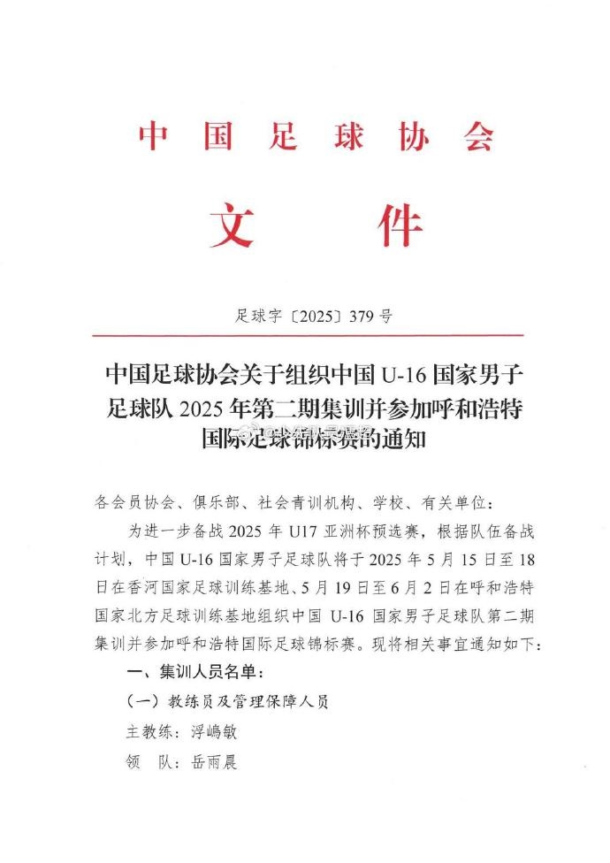 U16国足集训名单:邝兆镭、谢晋、万项、卢琦政在列,泰山7人
