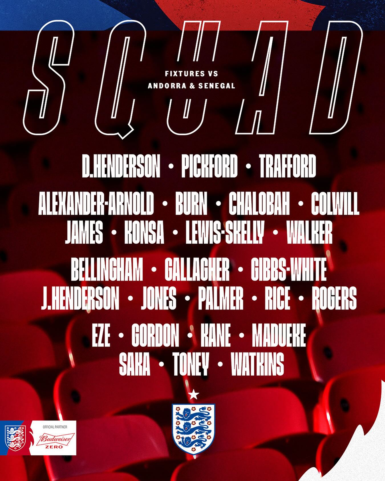 05月23日讯 英格兰国家队今日宣布大名单,在即将到来的国际比赛日中,英格兰将对阵安道尔和塞内加尔。
