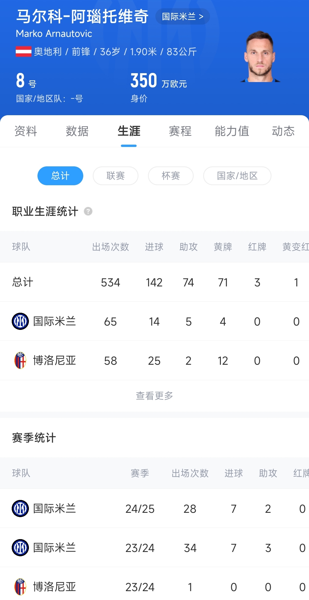 36岁的阿瑙托维奇职业生涯曾两度效力国米。2023年夏窗,阿瑙托维奇以租借加买断共1090万欧的价格,从博洛尼亚加盟国际米兰,开启国米二进宫生涯。两个赛季中阿瑙托维奇共代表国米出战62场比赛,贡献14粒进球和5次助攻。