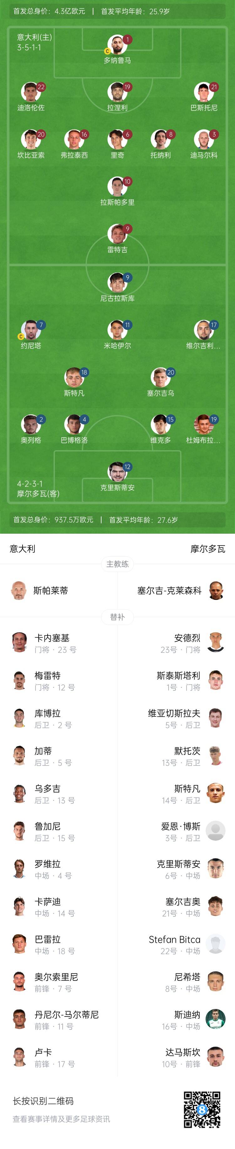 6月10日讯 世预赛欧洲区小组赛I组第4轮,意大利主场对阵摩尔多瓦。赛前,官方公布了本场的首发名单。