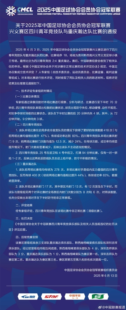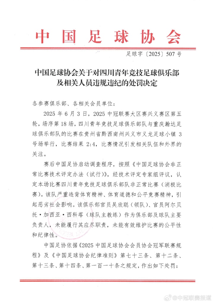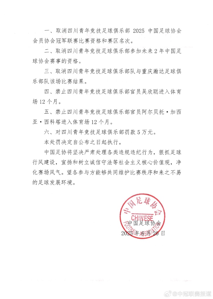 中国足协对四川青年竞技进行重罚:取消四川青年竞技2025中冠比赛资格和赛区名次,取消四川青年竞技参加未来2年中国足球协会赛事的资格,对四川青年竞技官员吴欣聪和阿尔贝托·加西亚·西科塔禁止进入球场12个月。