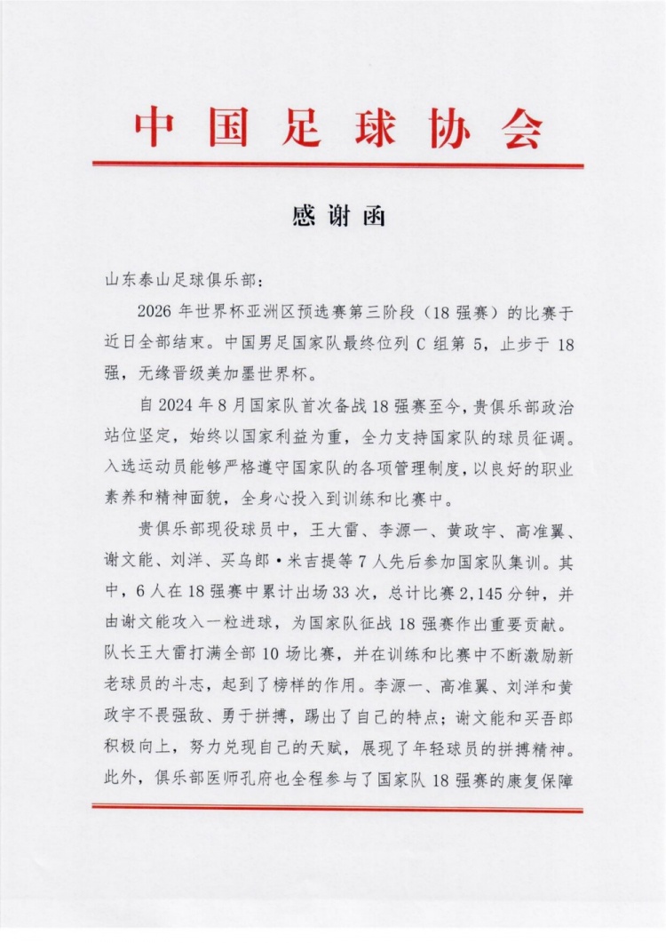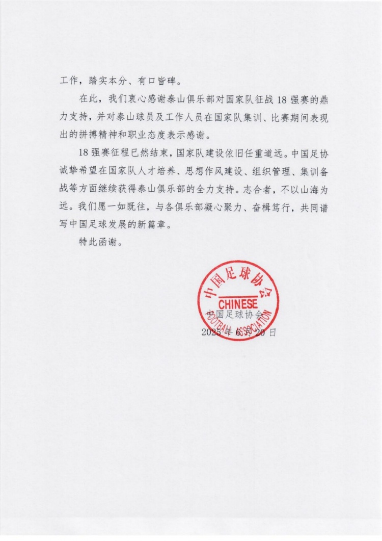 新黄河报道称,6月20日,中国足球协会向山东泰山足球俱乐部致感谢函,对山东泰山足球俱乐部全力支持国家队球员征调,备战2026年世界杯亚洲区预选赛第三阶段(18强赛)的比赛表示感谢,并对山东泰山队员在国家队集训、比赛期间表现出的拼搏精神和职业态度给予充分肯定。