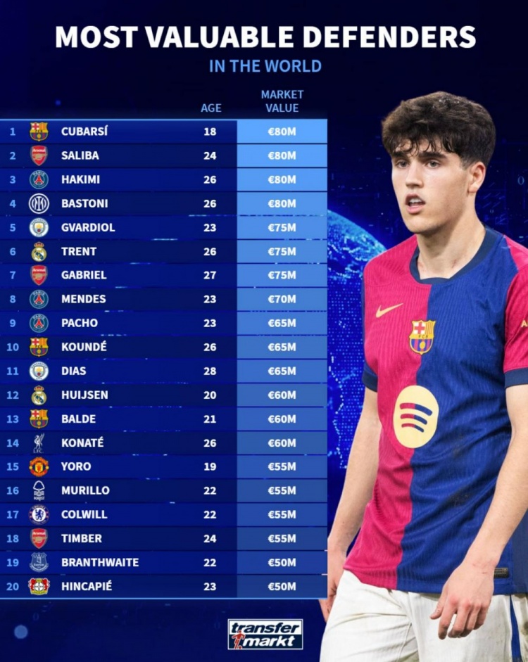 6月28日讯 德转盘点了世界足坛目前后卫位置身价最高榜单,其中库巴西等4人8000万欧最高,以下为具体榜单(身价相同年龄小者在先):