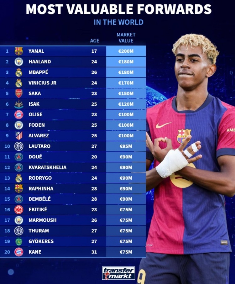 6月30日讯 《转会市场》统计了最新的锋线球员身价情况,巴萨17岁小将亚马尔以2亿欧元独自领跑。