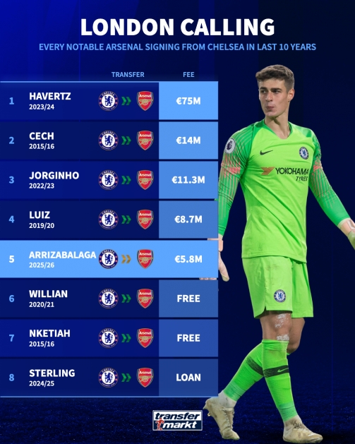 07月01日讯 随着阿森纳官方宣布签下前切尔西门将凯帕,德转也盘点了过去十年间阿森纳签下的切尔西球员,切赫、若鸟等人在列,包括上赛季租借加盟阿森纳的斯特林。其中,哈弗茨以7500万欧元转会成为阿森纳近十年从切尔西购买的最贵球员,凯帕以580万欧元位列第五。