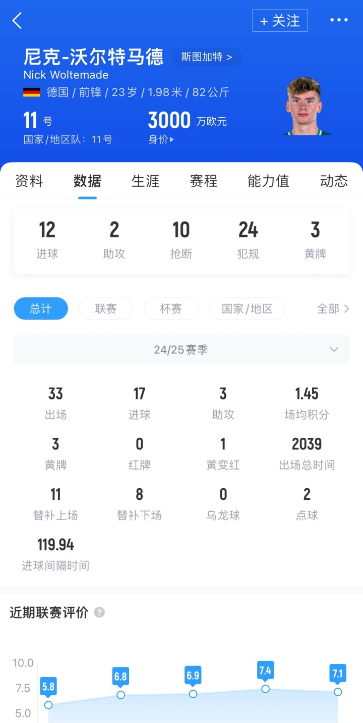 上赛季,沃尔特马德为斯图加特出场33次,收获17粒进球和3次助攻,目前其德转身价为3000万欧元。