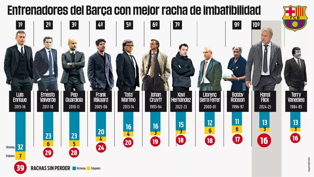 弗里克目前率巴萨连续16场不败排队史第10,第1是恩里克的39场